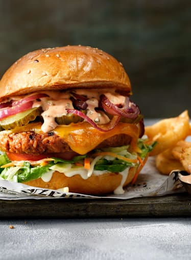 Panino con doppio filetto di pollo fritto leggermente speziato, insalata iceberg, cipolla,pomodoro ,cheddar,salsa burger, salsa oscar,porzione di Patatine, bibita ascelta